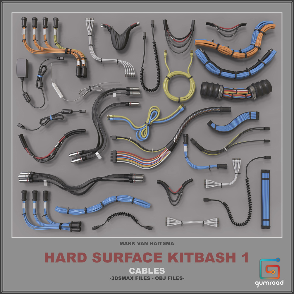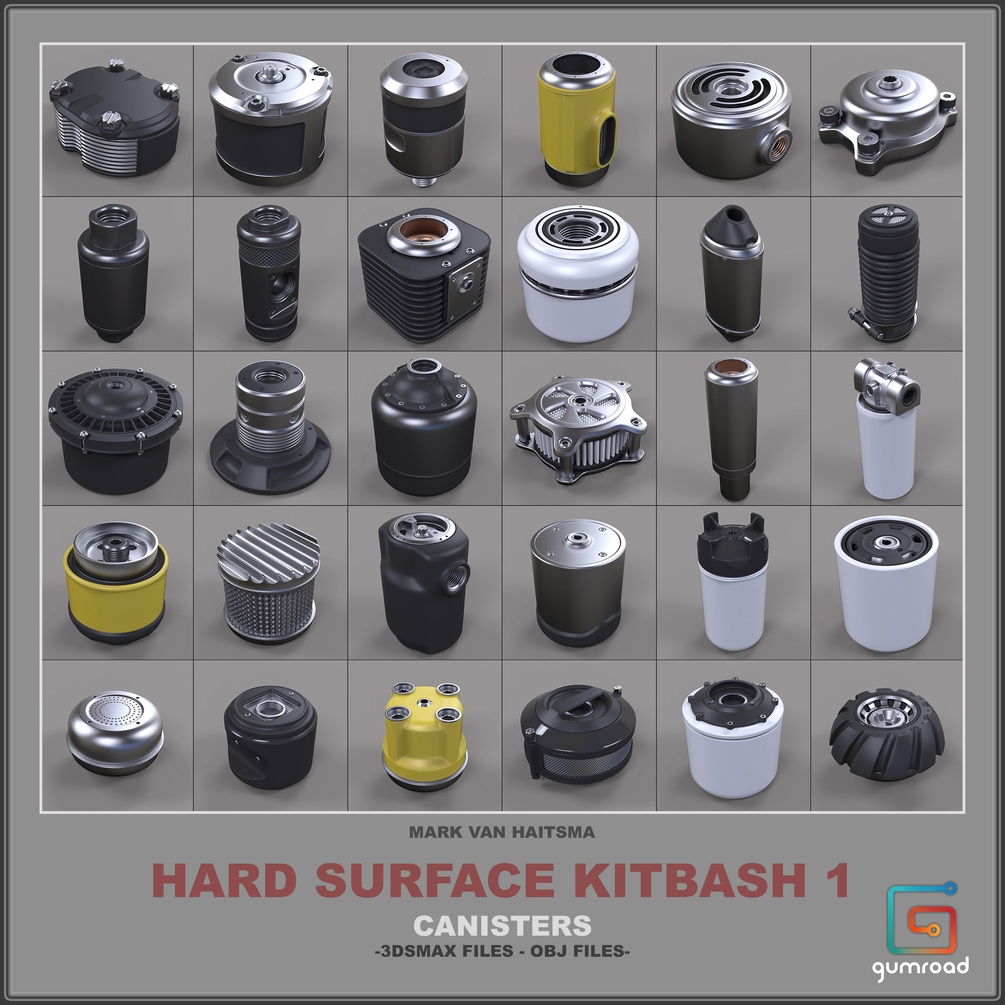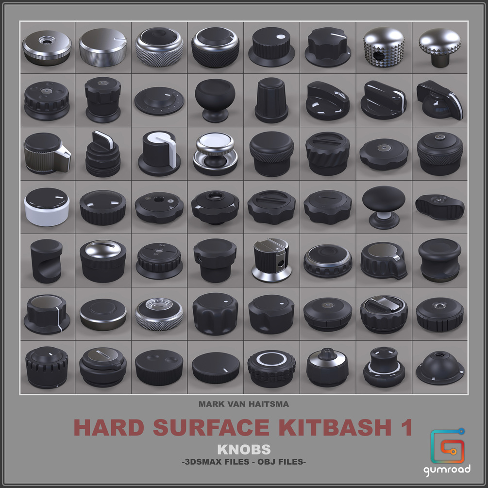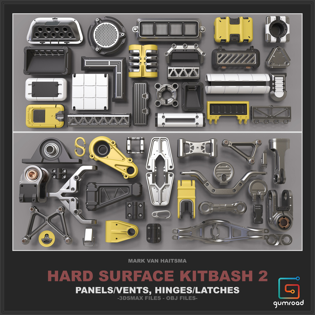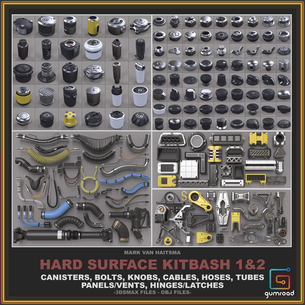 This is a 740+ piece set ready to be used for high poly additions to your models/concepts. It contains all of my kitbash libraries, Panels/Vents, Hinges/Latches, Canisters, Bolts, Knobs, Cables, Hoses, and Tubes.