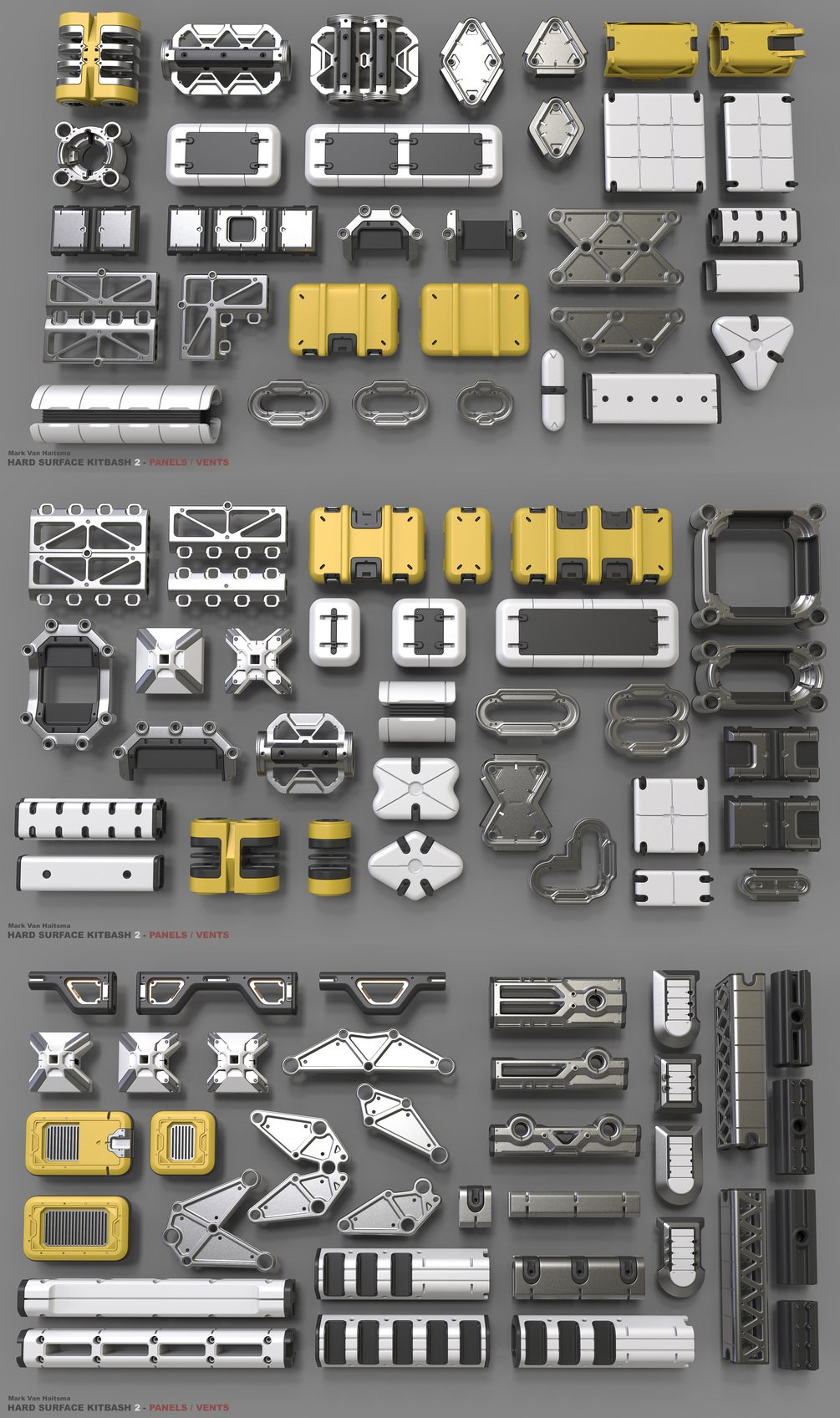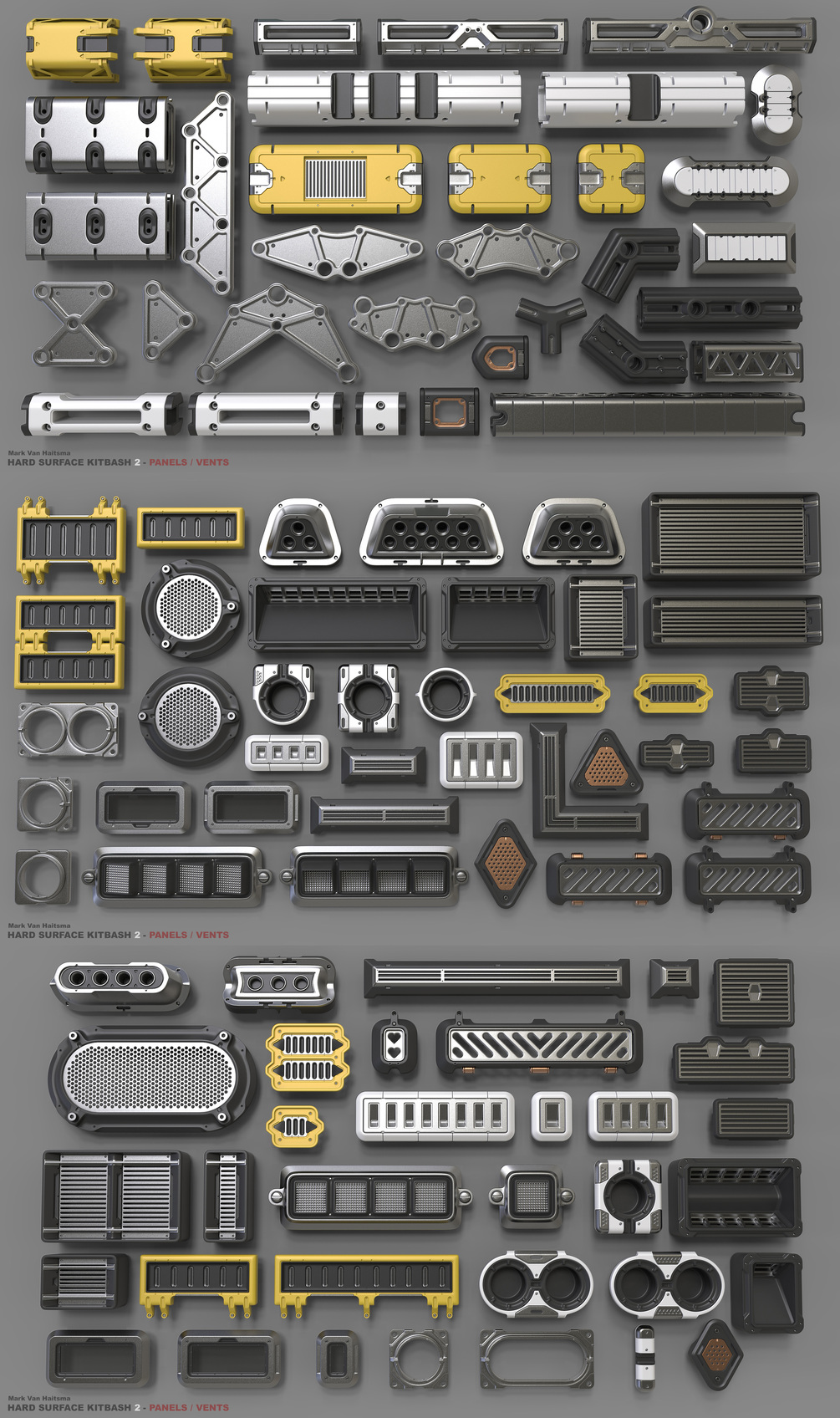 This is a 380+ piece set of panels, vents, hinges, and latches ready to be used for high poly additions to your models/concepts.